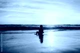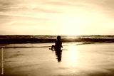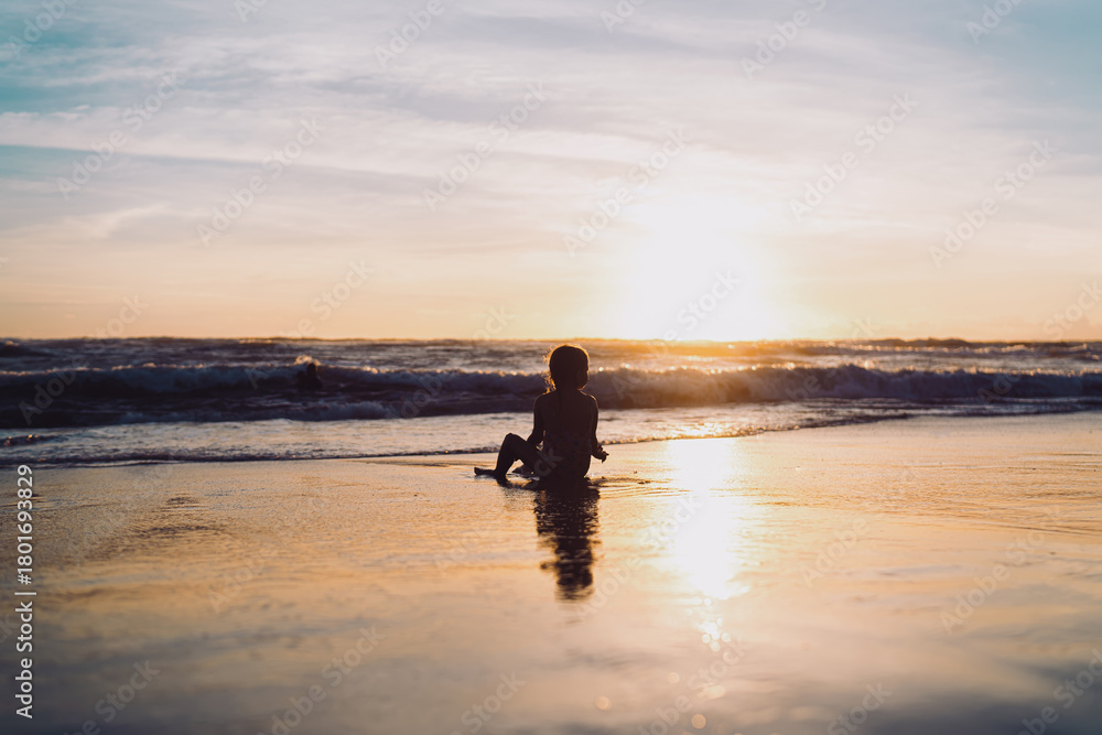 Child sitting on the wet sand watching sunset waves. The golden reflection and calm sea convey innocence, wonder, and mindfulness, representing connection between human emotion and natural beauty