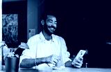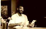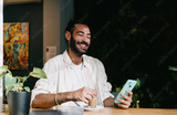 Smiling man with beard holding smartphone while stirring coffee in café. Conceptual stock photo about digital lifestyle, remote connection, authenticity, and modern communication.