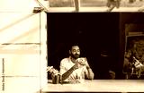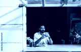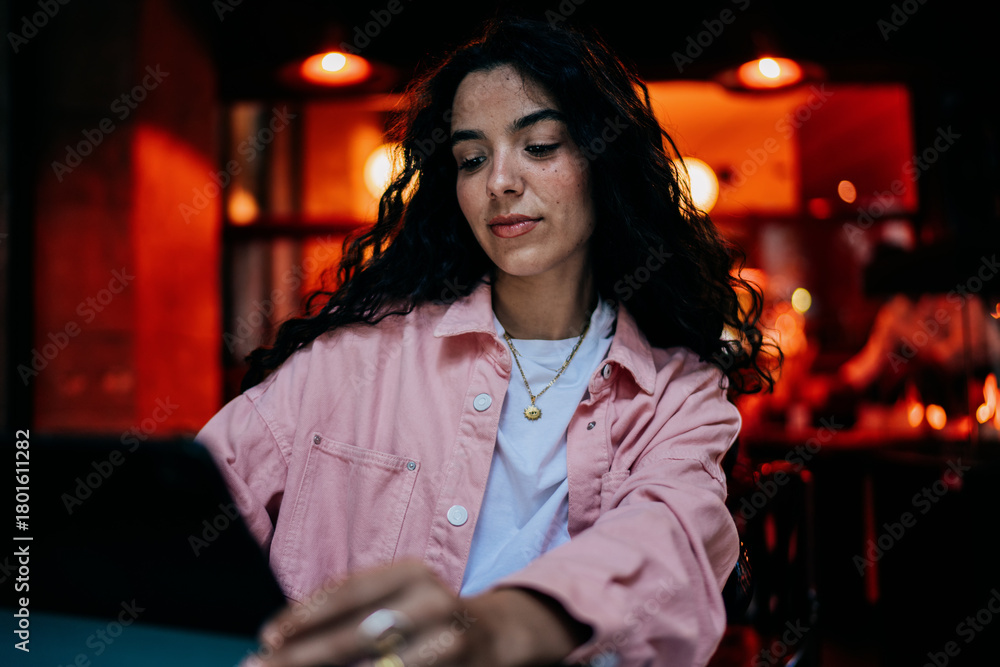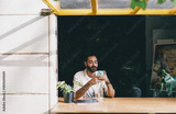 Man with beard using smartphone at café table, coffee and laptop visible. Conceptual image symbolizing independence, digital culture, communication, and modern mobile lifestyle.