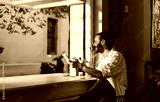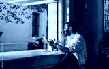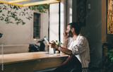 Side view of man waving into smartphone during video call at café, casual freelancer enjoying human connection through technology, modern communication lifestyle concept.