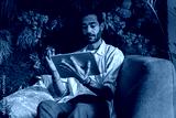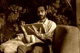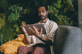 Man seated with tablet, engaged and serious, tapping screen in mid-gesture, illustrating digital navigation, emotional control, and personal tech fluency.