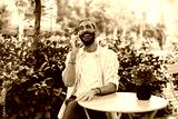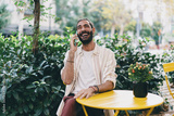 Man talks on phone while smiling at plant in front of him, showing casual harmony between personal expression, remote communication, and natural surroundings.
