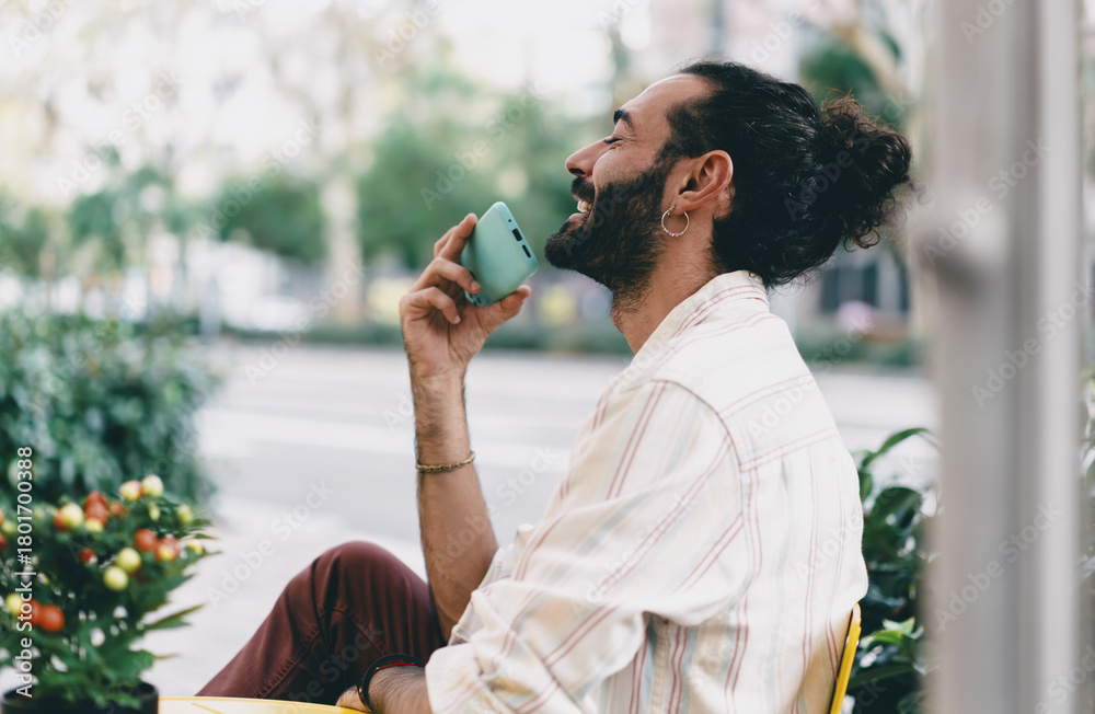 Young man smiles while recording voice message outdoors, relaxed and expressive, showing confidence, authenticity and freedom in digital communication flow.