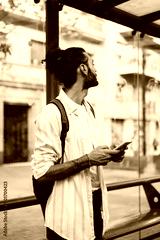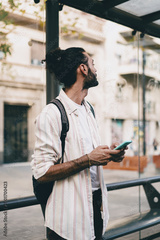 Standing man looks sideways holding smartphone, waiting calmly at bus stop, embodying tech-based readiness, digital awareness and quiet anticipation.