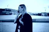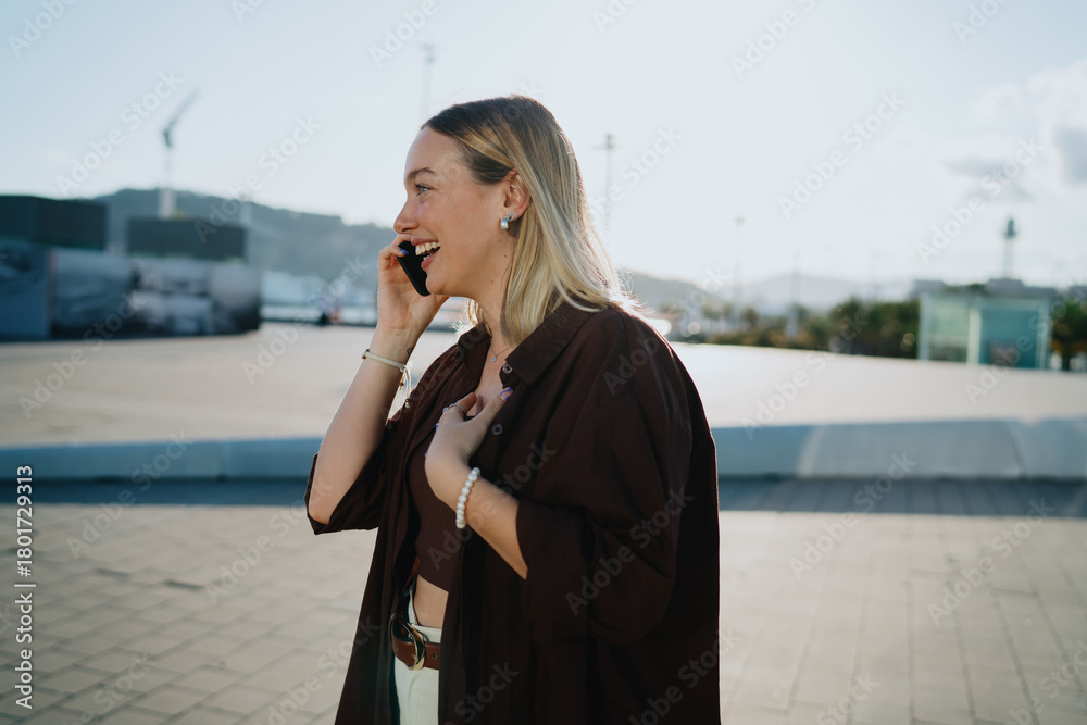 Laughing woman in brown shirt talking on smartphone outdoors, representing positive emotions, digital connection, independence and modern communication lifestyle.