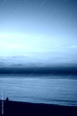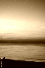 Lonely man sitting on the sea beach at sunset
