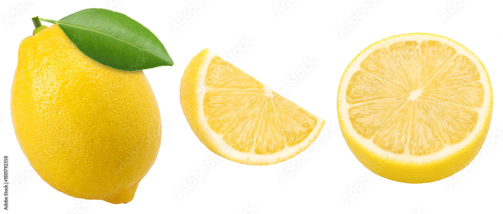 lemon fruit with leaves, slice and half isolated, Fresh and Juicy Lemon, transparent PNG, PNG format, cut out