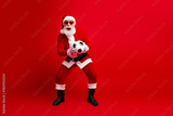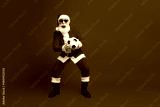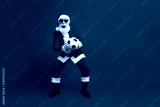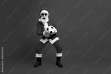 Santa Claus holding a soccer ball on a vibrant red background, showcasing holiday cheer and athletic spirit