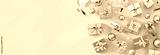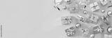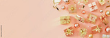 ピンクと金のギフトボックスとオーナメントが縁取る華やかなホリデー背景デザイン