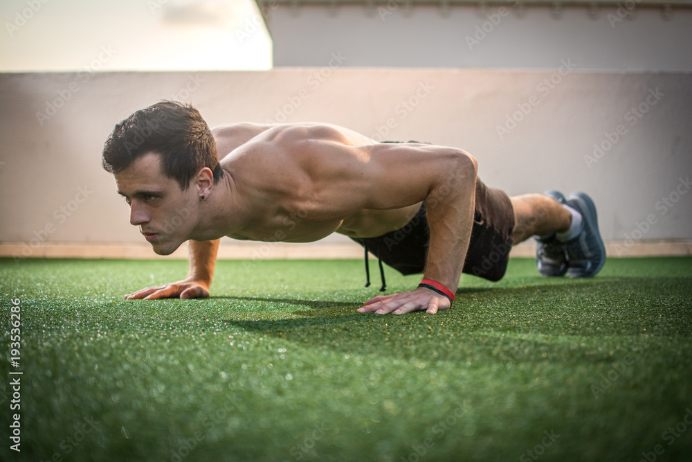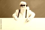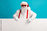 Santa Claus with red suspenders and a fluffy beard smiles behind a blank banner on a bright blue studio backdrop ready for Christmas promotion