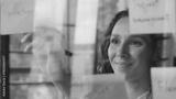 Hispanic woman office business worker write sticky notes writing stickers data information businesswoman female girl creating corporate project tasks working thinking about job plans on glass board