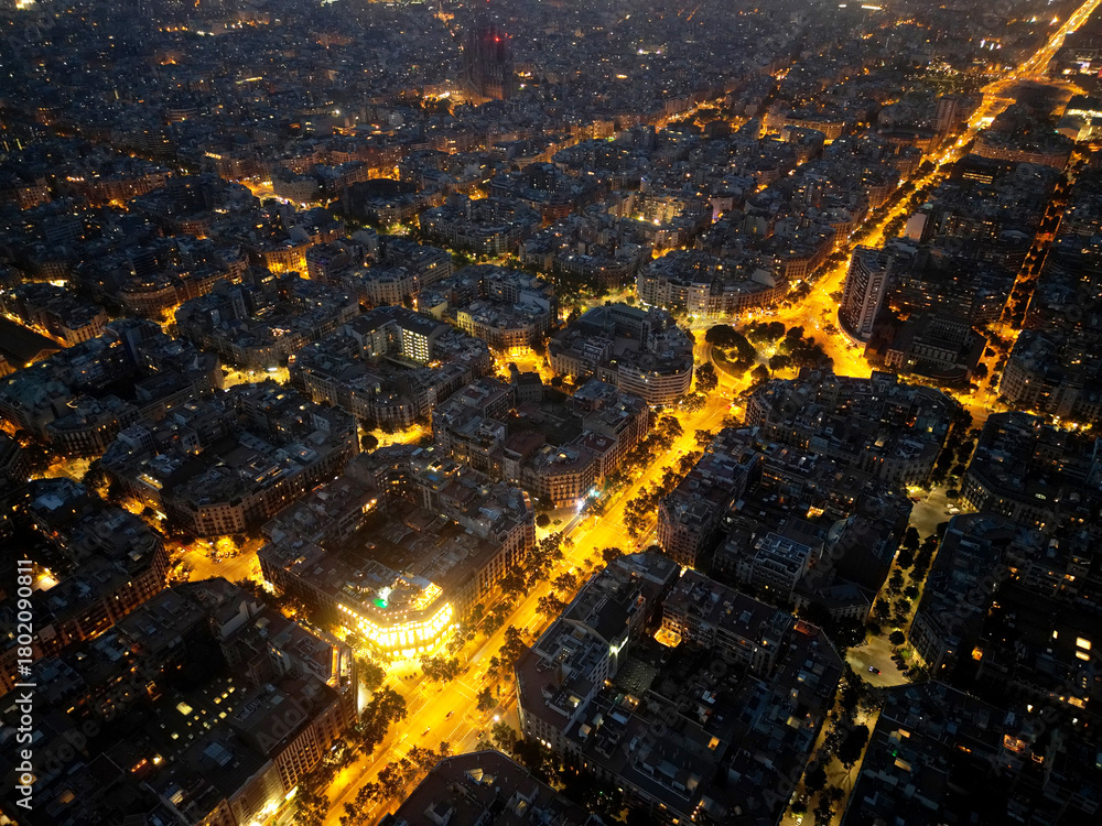 Central areas of Barcelona at night. Top view, filming from a drone.