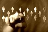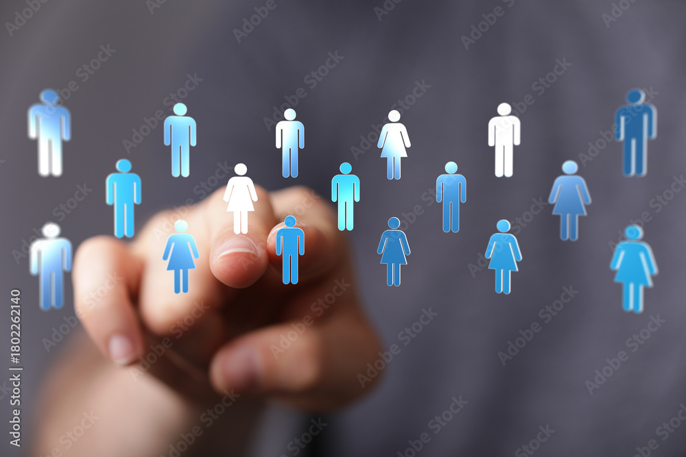 Hand pointing at people icons. Conceptual image of social networks, teamwork, and human interaction. Symbol of online community.