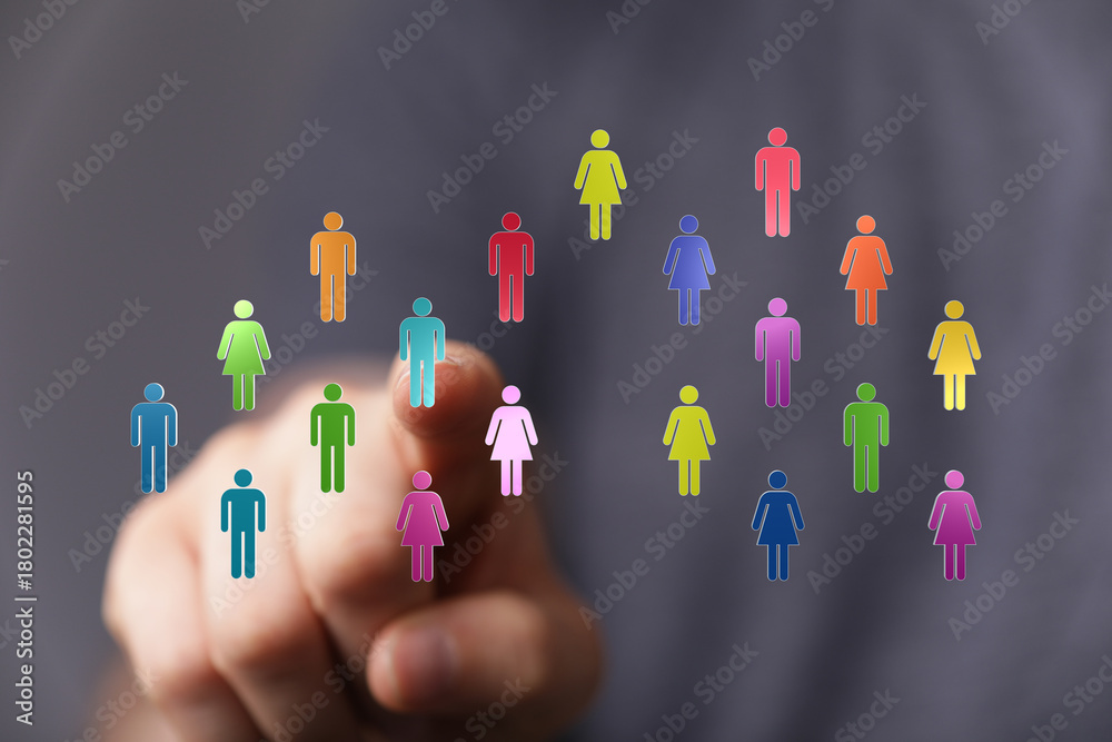 Hand pointing at colorful digital human icons, symbolizing community, teamwork, and connectivity. Representing diversity, inclusion, and the glo