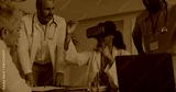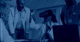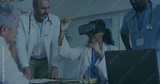 Interacting clinician wearing VR headset gesturing at meeting room table, laptop, lab coats, scrubs