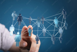 Concept of social network. Hand presses on connecting lines between people figures. Business and communication.
