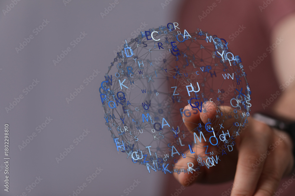 Abstract image of a person touching a digital network sphere composed of letters, symbolizing connection and in