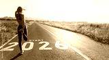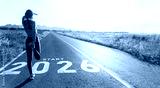 New year 2026 or start straight concept.word 2026 written on the asphalt road and athlete woman runner stretching leg preparing for new year at sunset.Concept of challenge or career path and change.