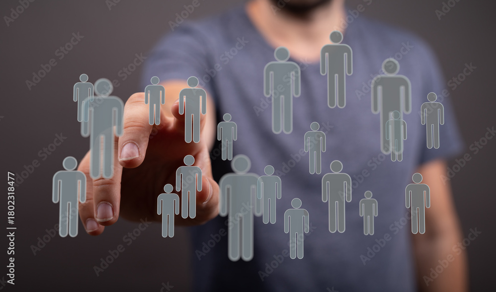 A person's hand interacting with virtual human icons, representing social connections, teamwork and online netw