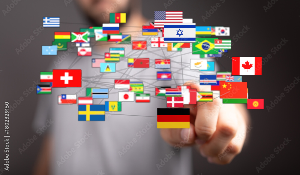 A visual representation of global connectivity through a network of flags, symbolizing international relations, digital communication, and the i