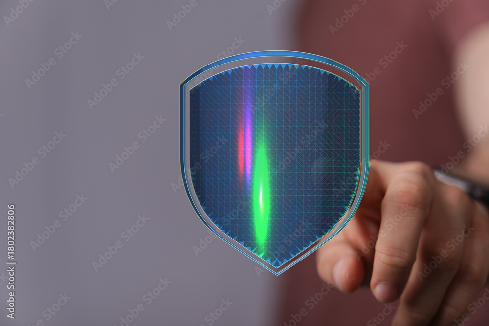 Hand holding a futuristic digital shield concept. Represents protection, security, and technology in a modern world. Great for cyber