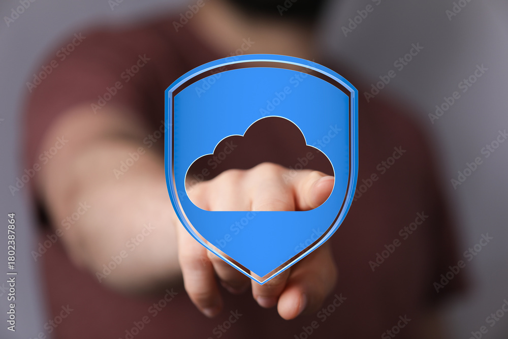 Person pointing at a cloud icon within a shield. Representing online security, data protection, and cloud compu