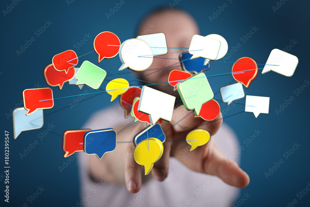 Abstract network of connected speech bubbles illustrating communication, ideas, and sharing in a digital world.