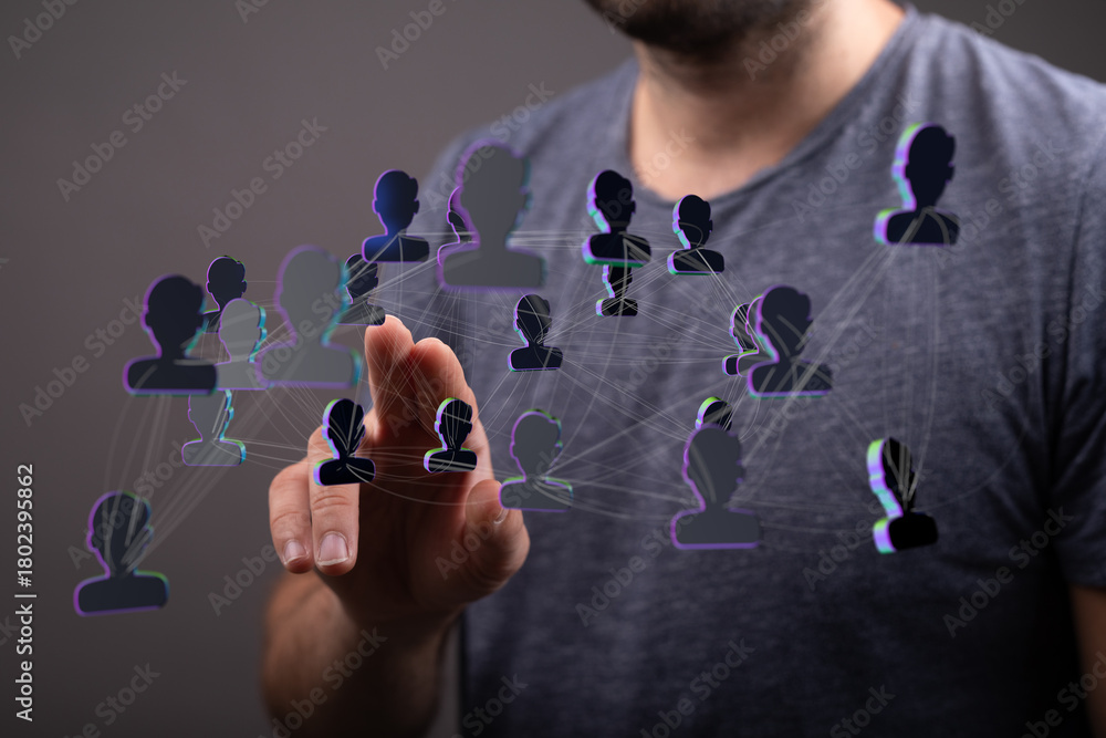 Close-up of a man's hand interacting with virtual connections representing a social network concept.