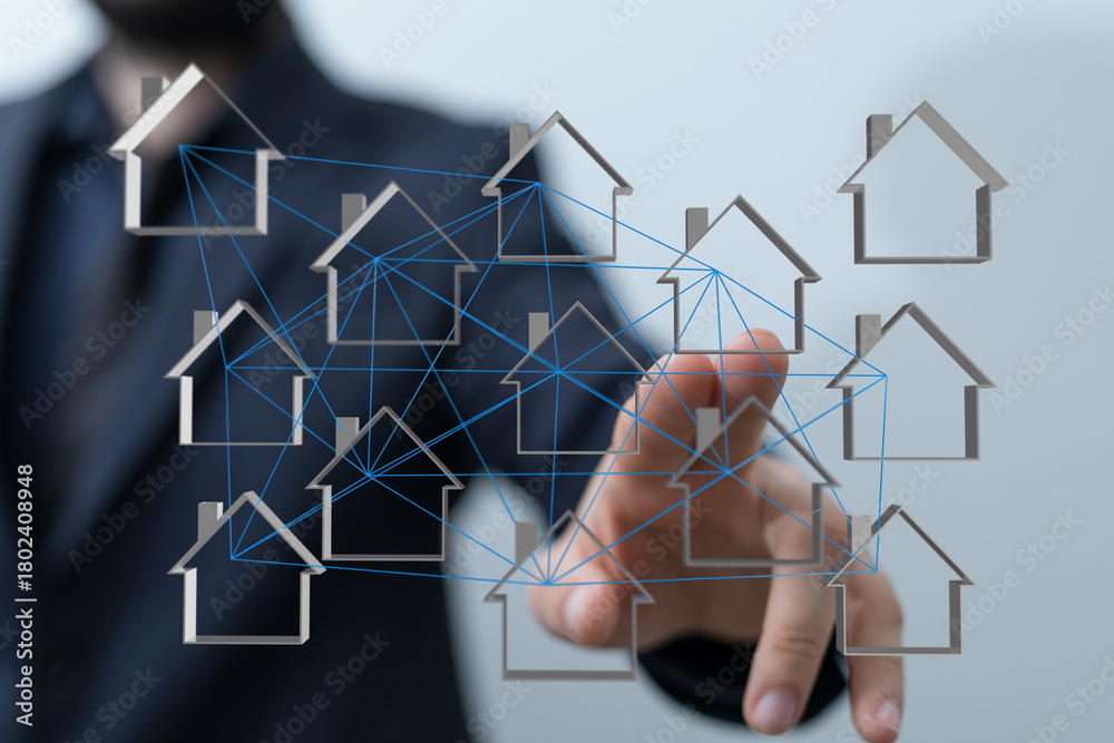 Concept image showing a network of connected houses, representing property, real estate, and digital connections with a human hand interacting w