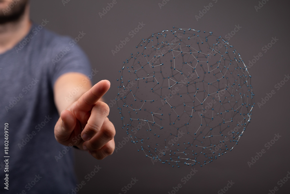 A person's hand interacting with a 3D digital sphere representing networking, connectivity, and the digital world.