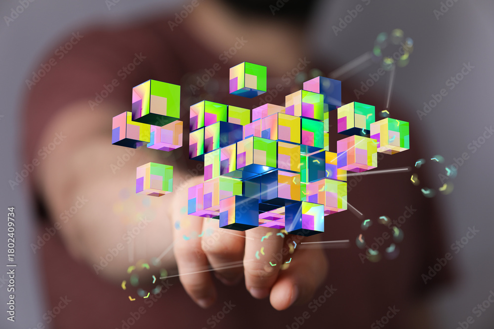 Abstract image showing a hand interacting with colorful digital cubes representing data and networks. Futuristi