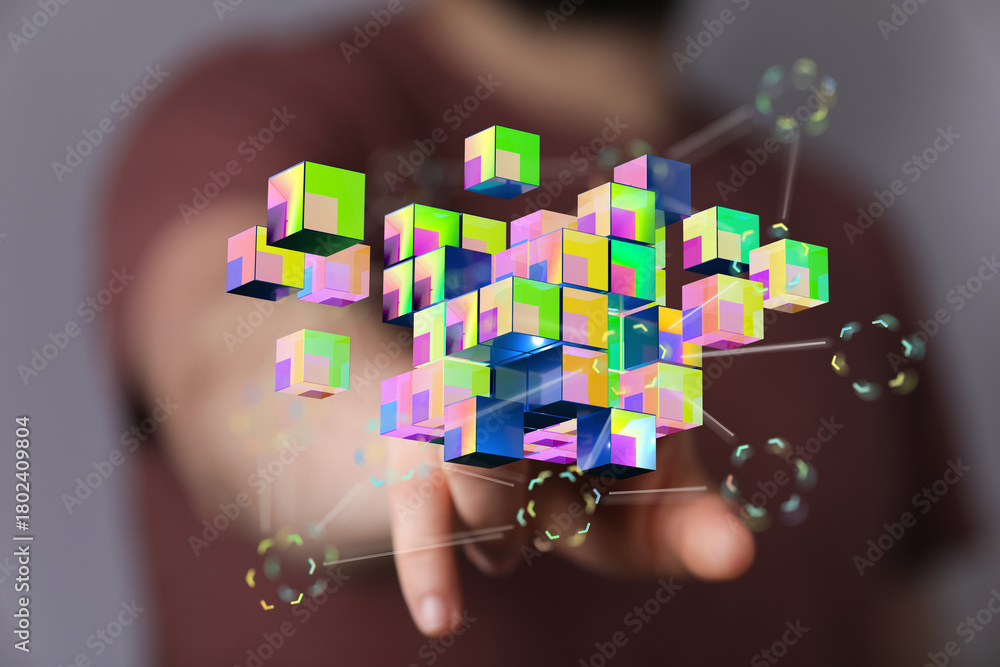 Digitally rendered image of colorful cubes with person's hand, representing technology and data. Abstract digit
