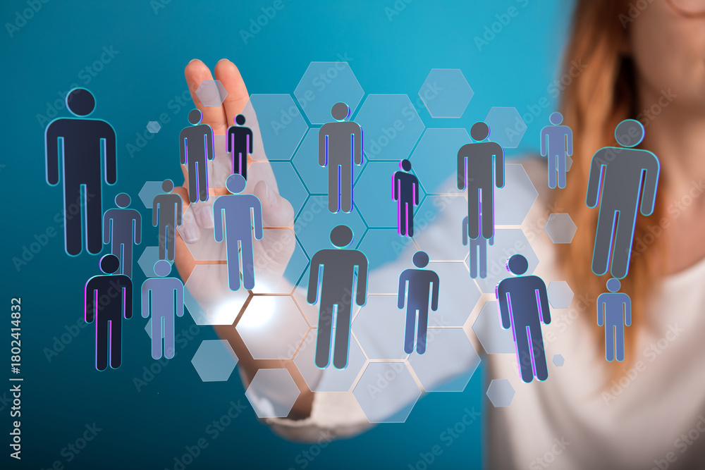 Woman interacting with a network of digital human figures. Illustrating connection, communication, and technolo