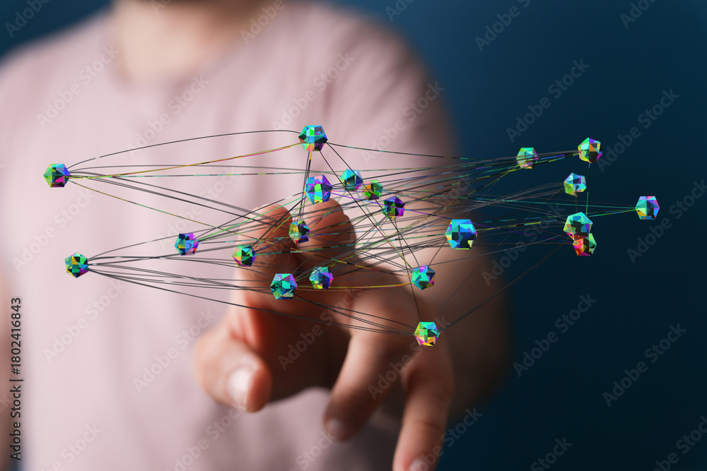 Abstract image of hand reaching towards a network node. Concept of data, connection, networking, technology and