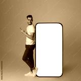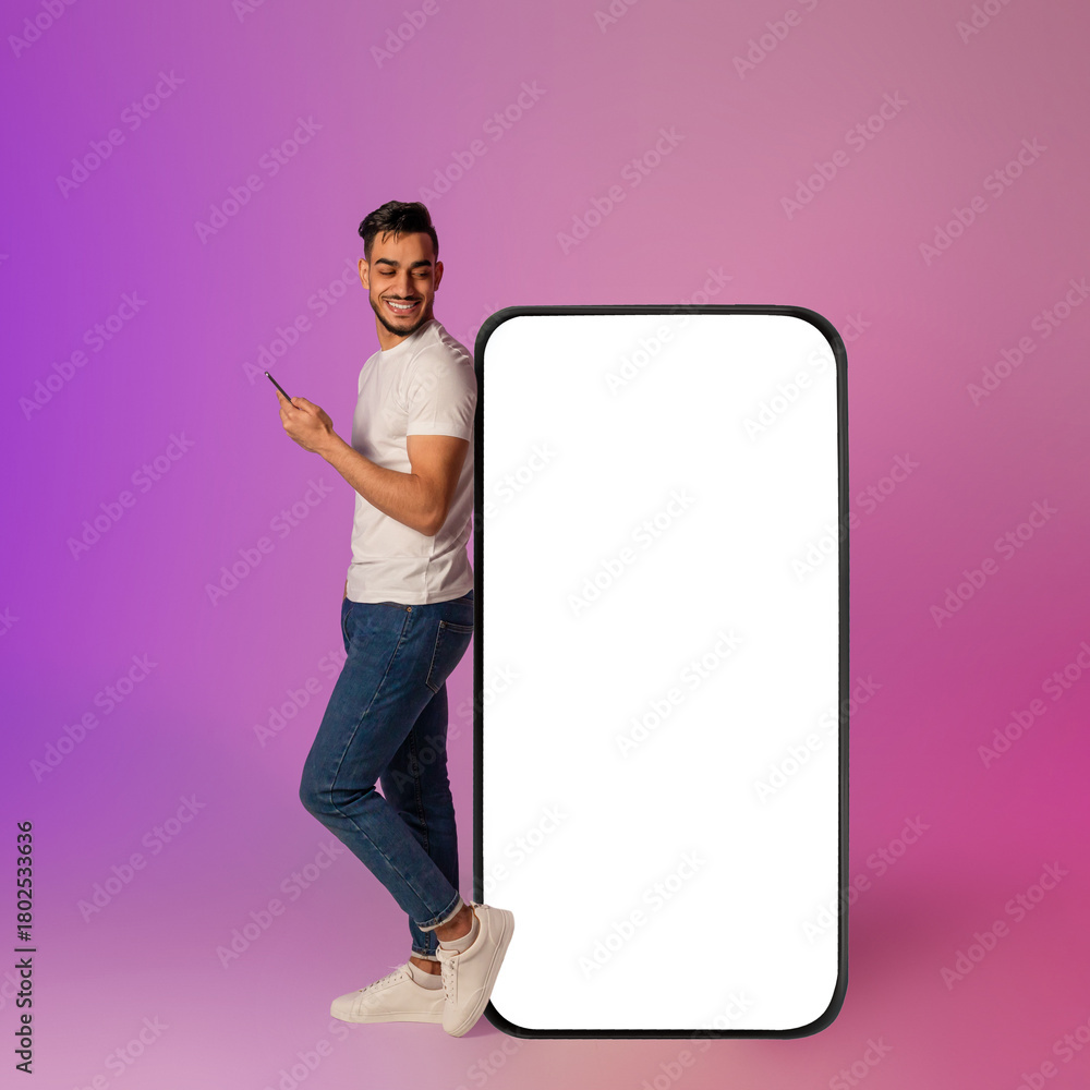A joyful young Arab man interacts with his mobile device while leaning against a large smartphone mockup.