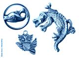 Isolated photo of various shaped silver colored animal pendants on white background.