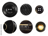 Isolated photo of various black and ivory plastic cloth buttons on white background.
