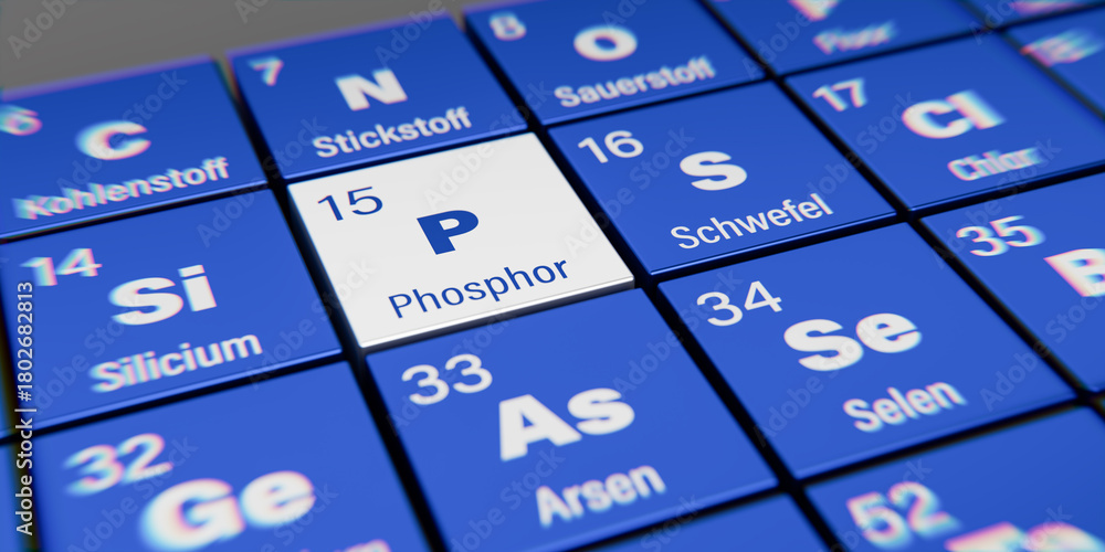 Detail view of chemical element P Phosphorus (German: Phosphor) with atomic number 15 within the periodic table of elements in German. Dynamic dispersion effect at the corners, shallow depth of field.