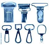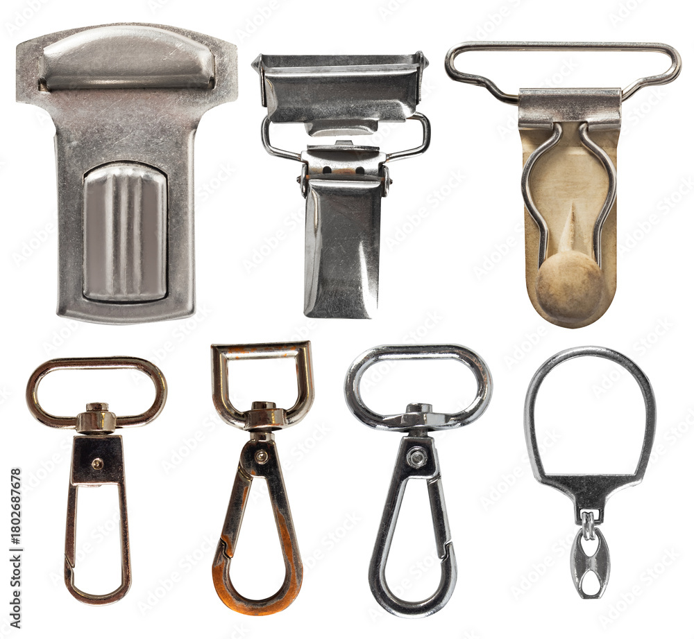 Isolated photo of various style metal cloth or chain spring hooks and holders on white background.