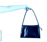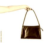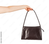 Isolated photo of female hand holding brown leather purse or bag with copy space on white background. front view.