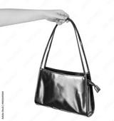 Isolated photo of female hand holding brown leather purse or bag with copy space on white background. Side view.