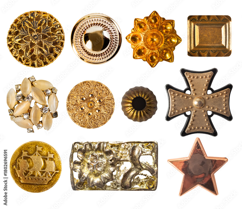 Isolated photo of various vintage bronze and gold metal decorative cloth buttons or rivets on white background.