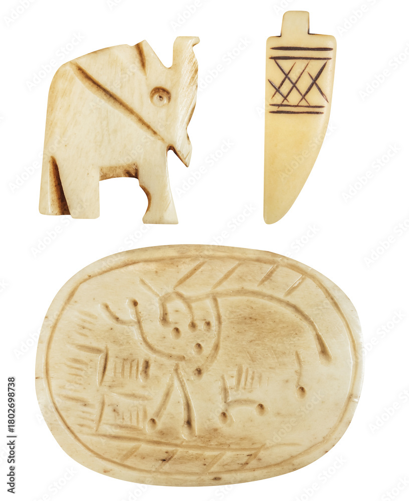 Isolated photo of ivory tribal pendants with elephant shape elements, tooth and engravings on white background.