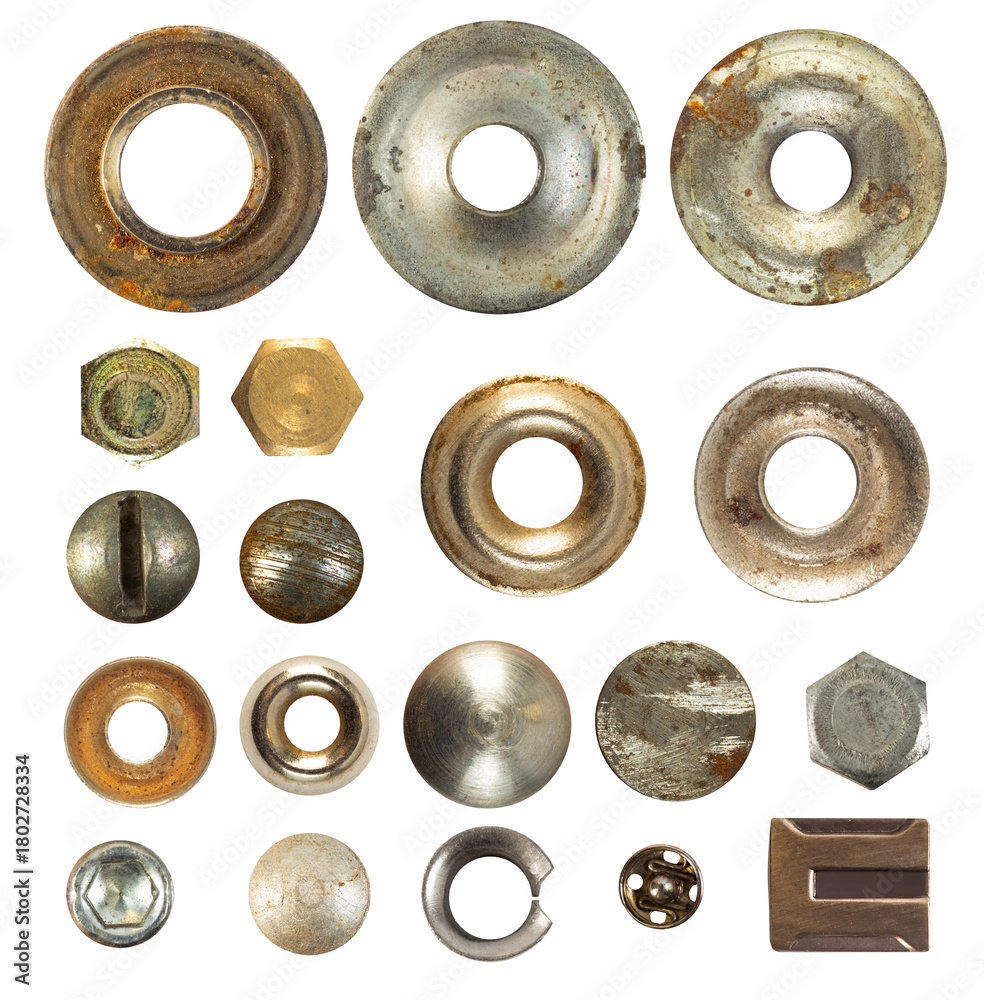 Isolated photo of worn, vintage and rusty metal and copper cloth button, screw and rivet elements on white background.