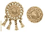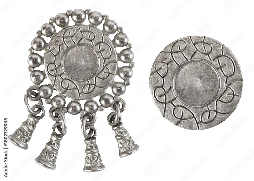 Isolated photo of vintage steel baroque metal decorative ethnic style pendants, brooch, buttons or elements on white background.