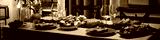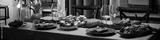 Header of Thanksgiving dinner table set with pumpkin pie, roasted vegetables, assorted gourds, wine glasses, plates, napkins, festive centerpiece, no people visible, indoor setting