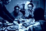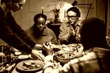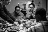Group of diverse young adults and Black woman sitting around table sharing Thanksgiving dinner, eating and talking, hands reaching for food, festive meal setting, autumn decorations visible