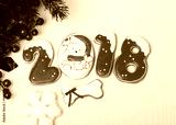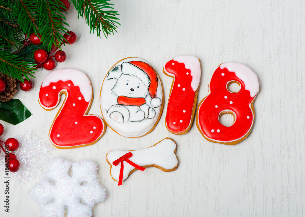 Christmas background with gingerbread, Christmas trees and snowflakes with pine cones.