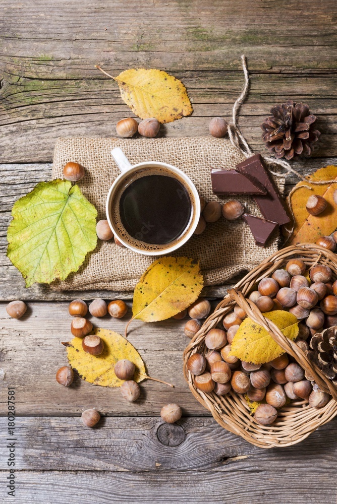 black coffee on wooden table with chocolate , hazelnuts, and fallen leaves decoration. on wooden table. top view