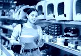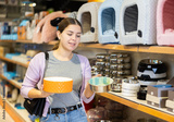 Interested young woman choosing functional and safe bowl for puppy in pet supplies store, looking and comparing different models